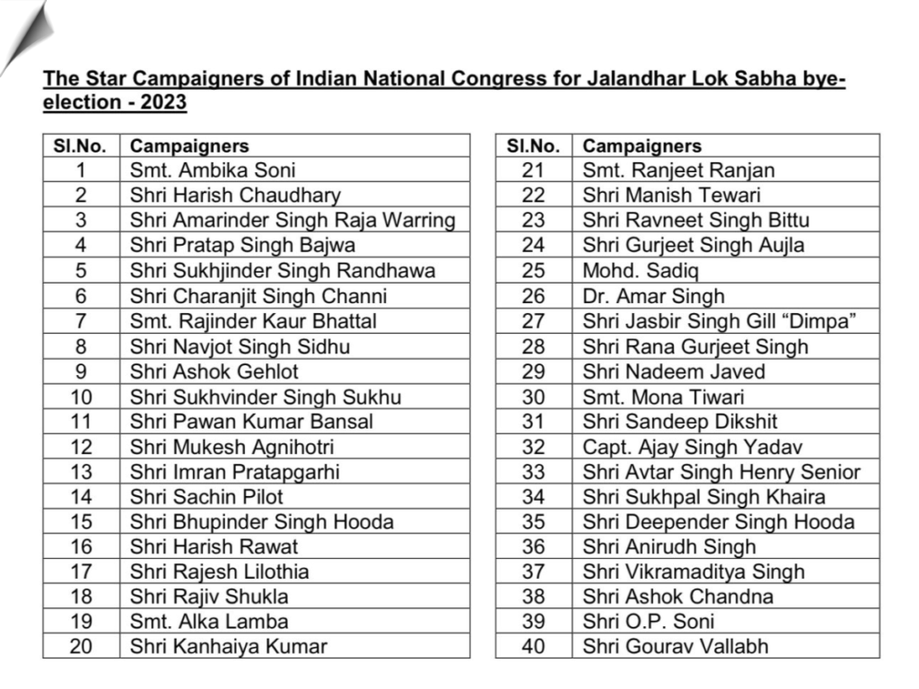 Congress releases a list of star campaigners for the upcoming Lok Sabha by-election to Jalandhar constituency.